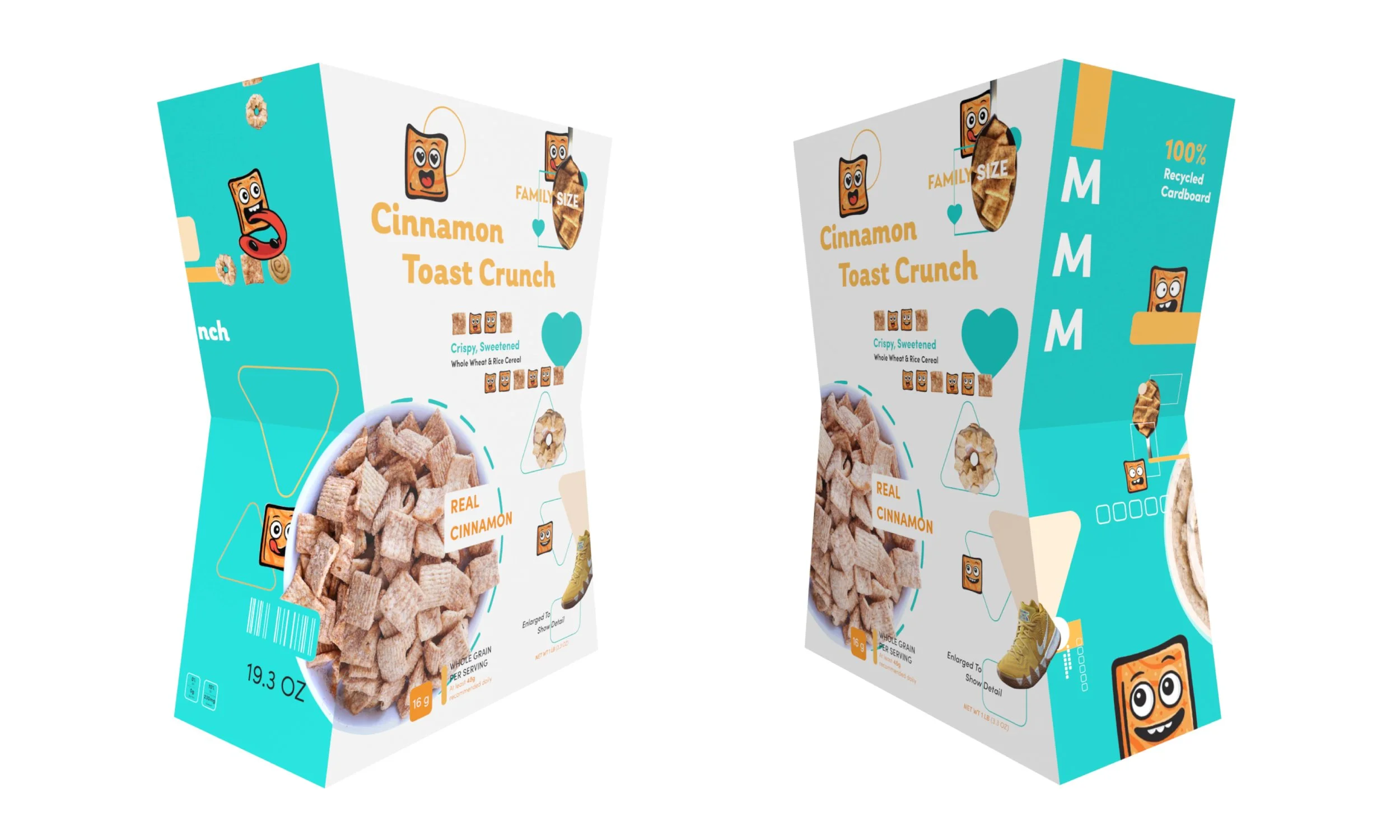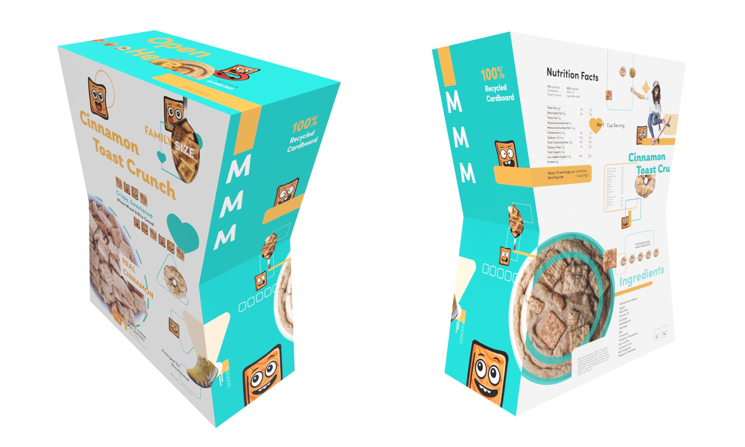 The original Cinnamon Toast Crunch package elements were deconstructed and re-conceptualized into new compositions and a 3D package. It was conceptualized through the use of images, lines, patterns, abstract shapes, and text to create a new, modern, and experimental design. Composition, alignment, color, typographic treatment, and hierarchy were used to visually communicate the reconceptualization. The shape of the package mimics the cinnamon toast crunch in a fun and unique geometric form.