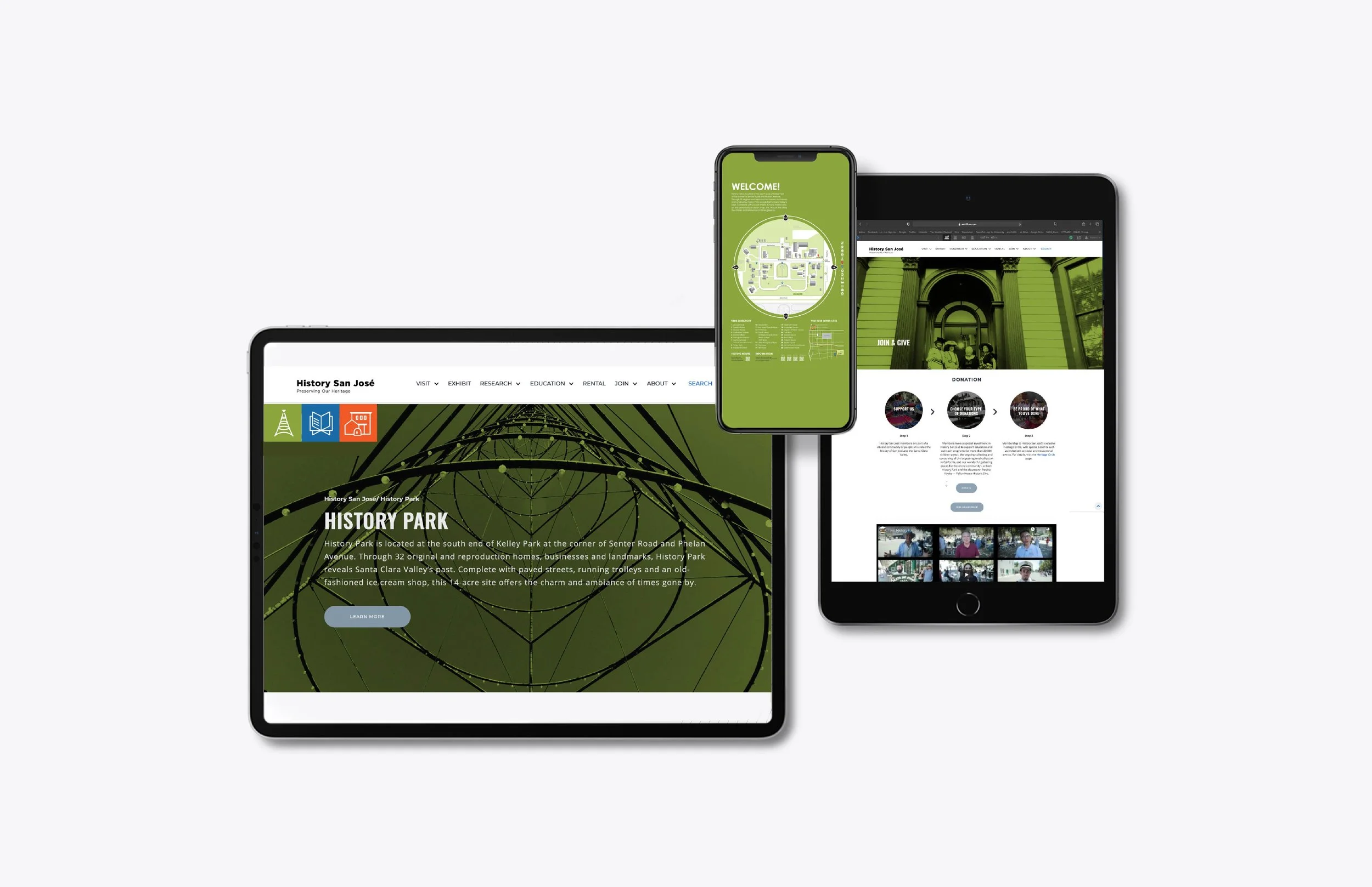 The three different icons that make up the logo represent the different sites that History San José has to offer. The green block represents the History Park site filled with 32 original and reproduction homes, businesses, and landmarks. The blue block represents the Archive Center. The orange block represents the Peralta Adobe & Fallon Houses historical site.